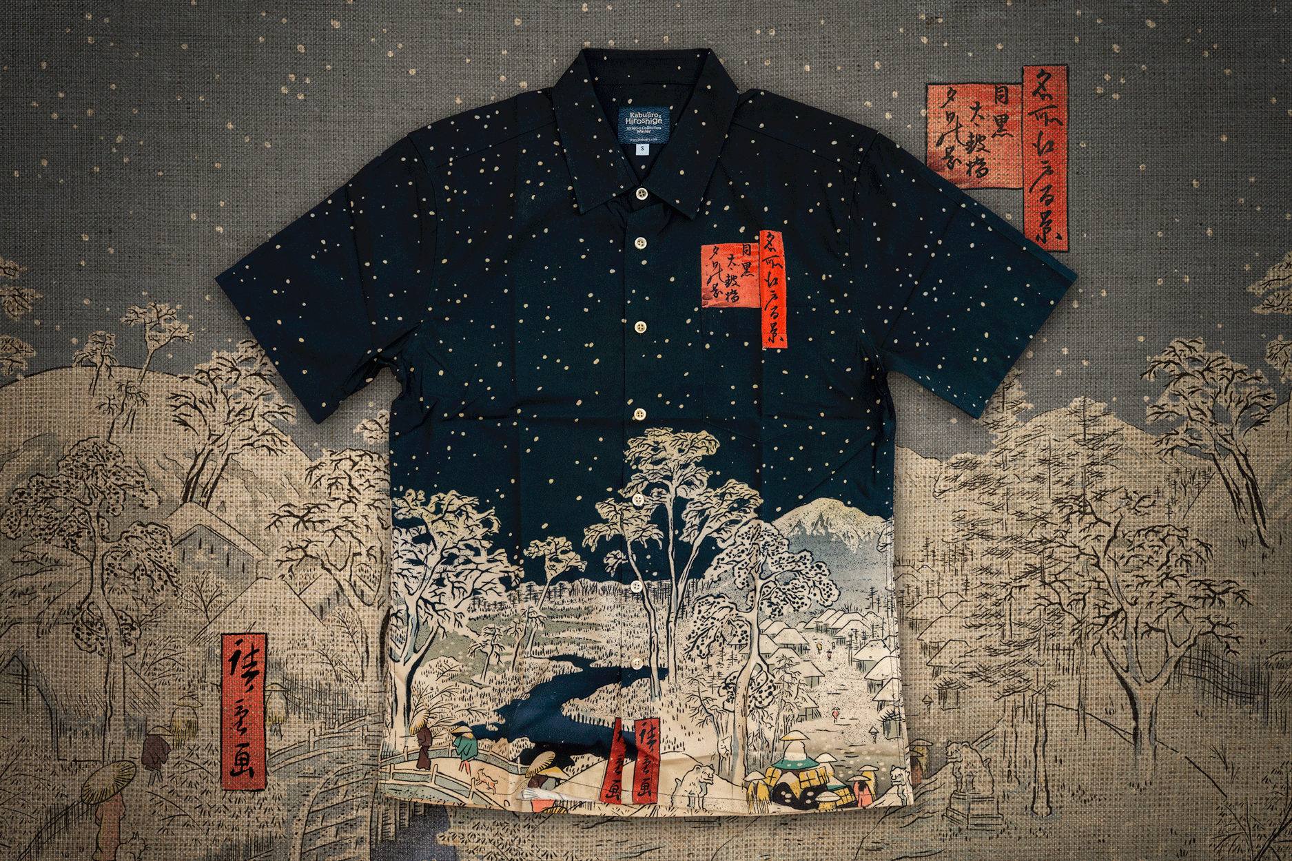 This natural fiber shirt features a ukiyo-e design inspired by woodblock prints by Hiroshige.